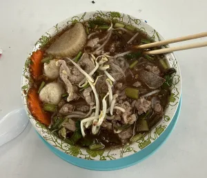 麺は春雨のように細く透明感があり、するするっと喉越しが良いタイプ。上にはたっぷりのもやしと空芯菜、そして豚肉(たぶん)。味はしっかりしていて、意外と満足感あり。大根や人参、肉団子も入っていて、見た目以上に具だくさん。